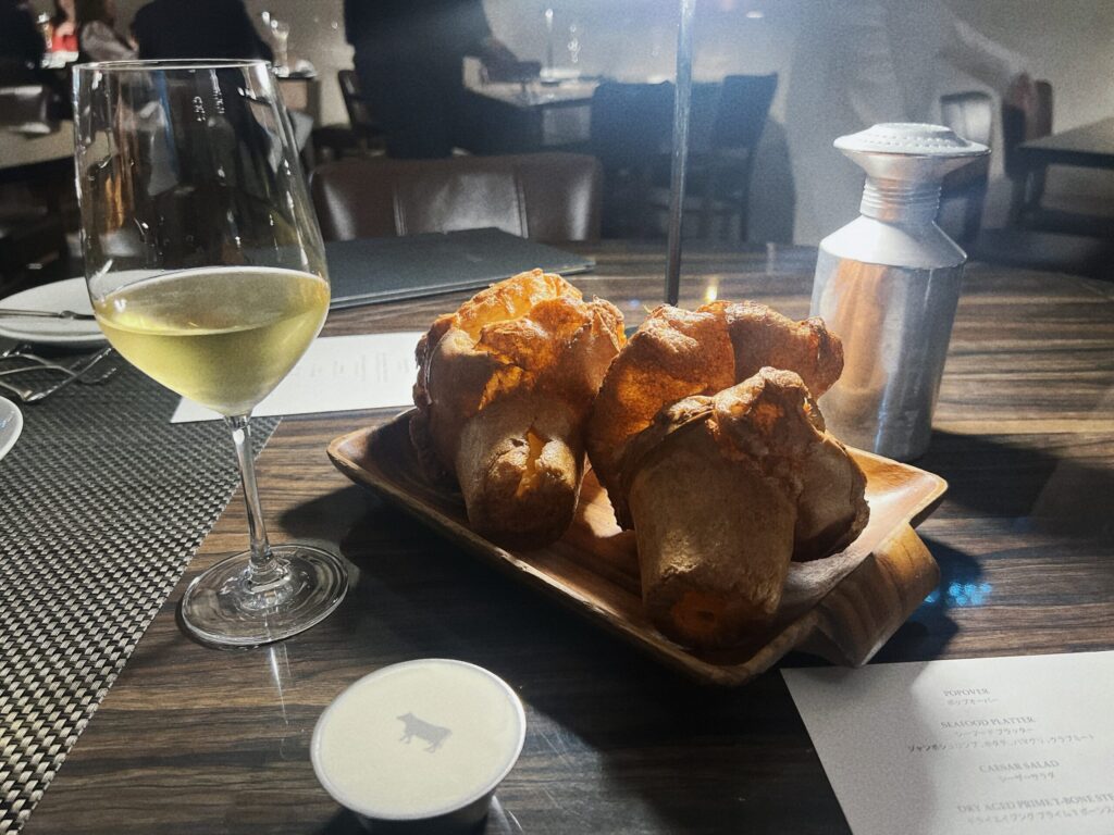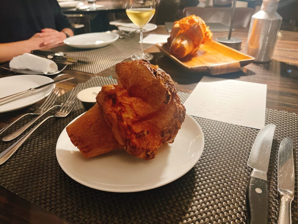 コースの一品目には、レタスほどの大きさのポップオーバーというシュー皮状のパンが提供されました。アメリカ生活時代にもどこかで食べたような気がしますが…残念ながら、場所は思い出せませんでした。
