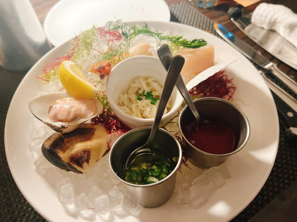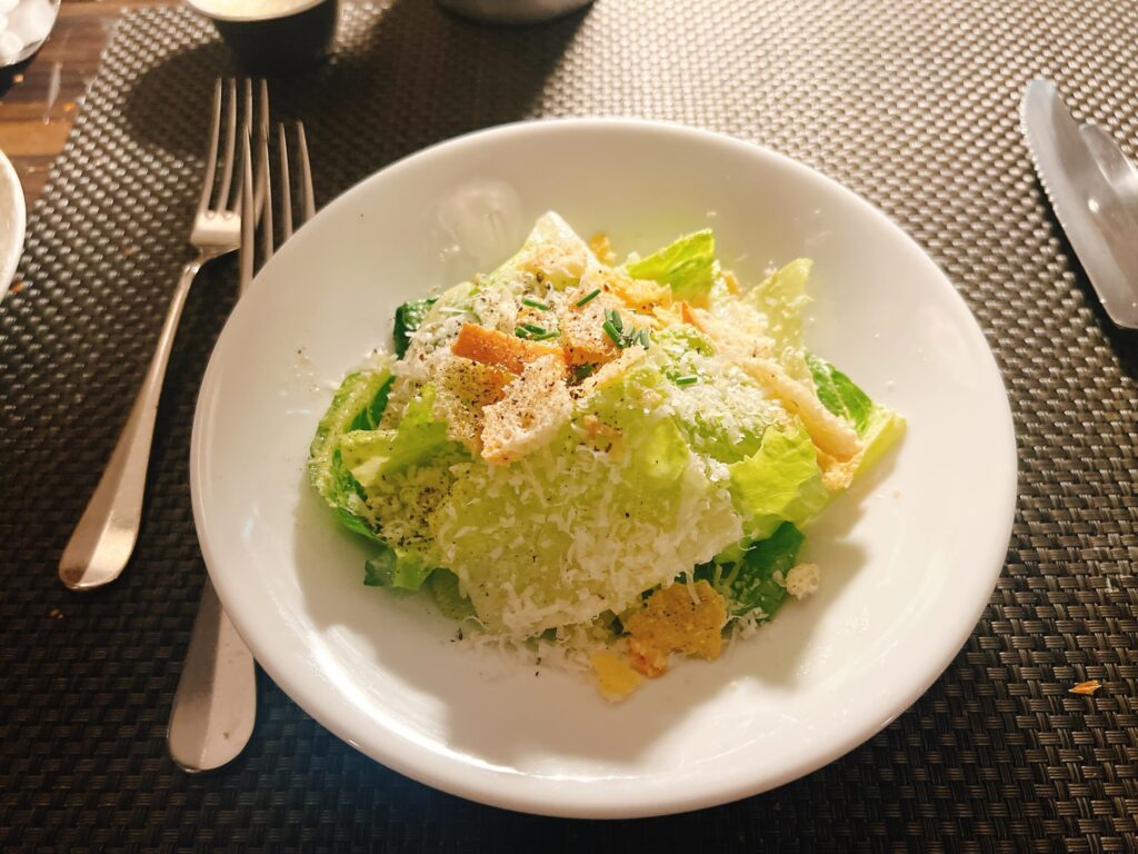 そこからシーフードプレート、シーザーサラダと続きます。メニューの一品一品にはアメリカっぽさを感じますが、アメリカなら2人分が同じ皿にドドんっ!と盛られて提供されることがほとんどです。しかし、やはりここは日本。最初から一人前ずつおしとやかに盛られているのを見て、アメリカと日本の文化の違いを感じずにはいられませんでした。