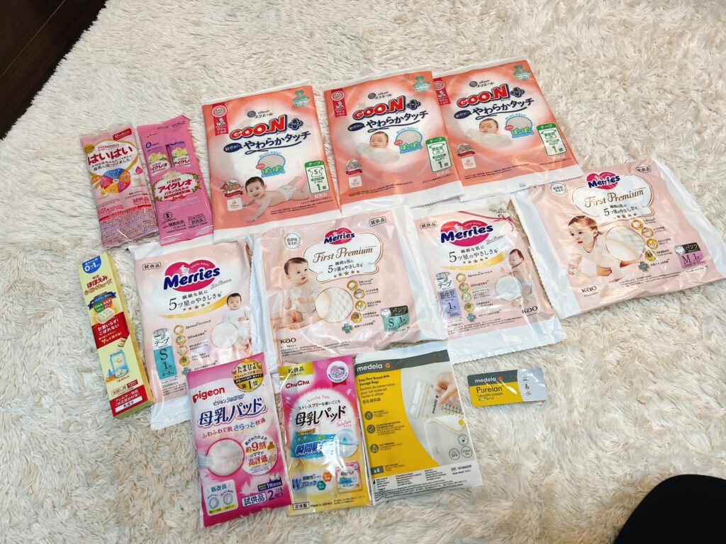 中にはサイズやブランド違いのおむつ、ミルク、母乳パットなどの試供品がたくさん入っていました。