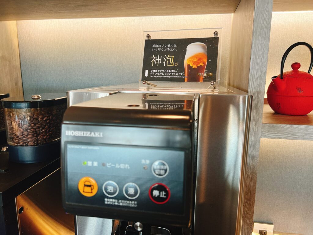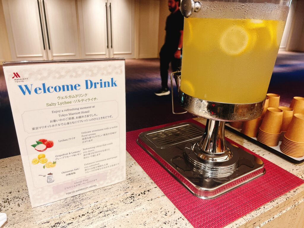 さて、チェックイン。フロントに設置されたウェルカムドリンクが味が濃くて甘くて美味しかったです。