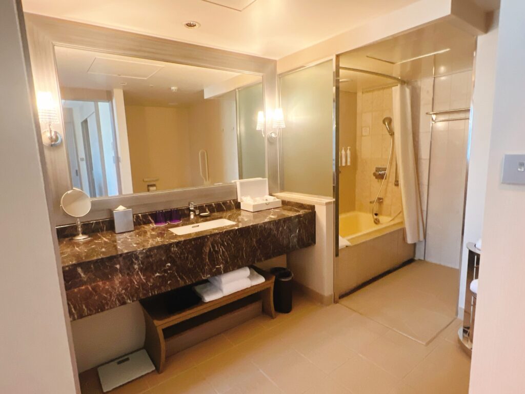 今回の宿泊先は東京マリオットホテル。品川駅や北品川駅が最寄りとなっており、品川駅からは京成側のバス乗り場からシャトルバスが出ています。歩ける距離ではありますが、坂道だったり横断歩道が少なかったりで少し不便なところにあるので、シャトルバス利用が安心かなと思います。