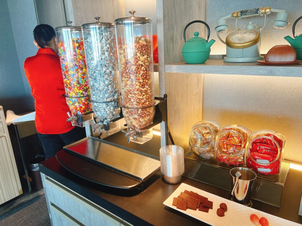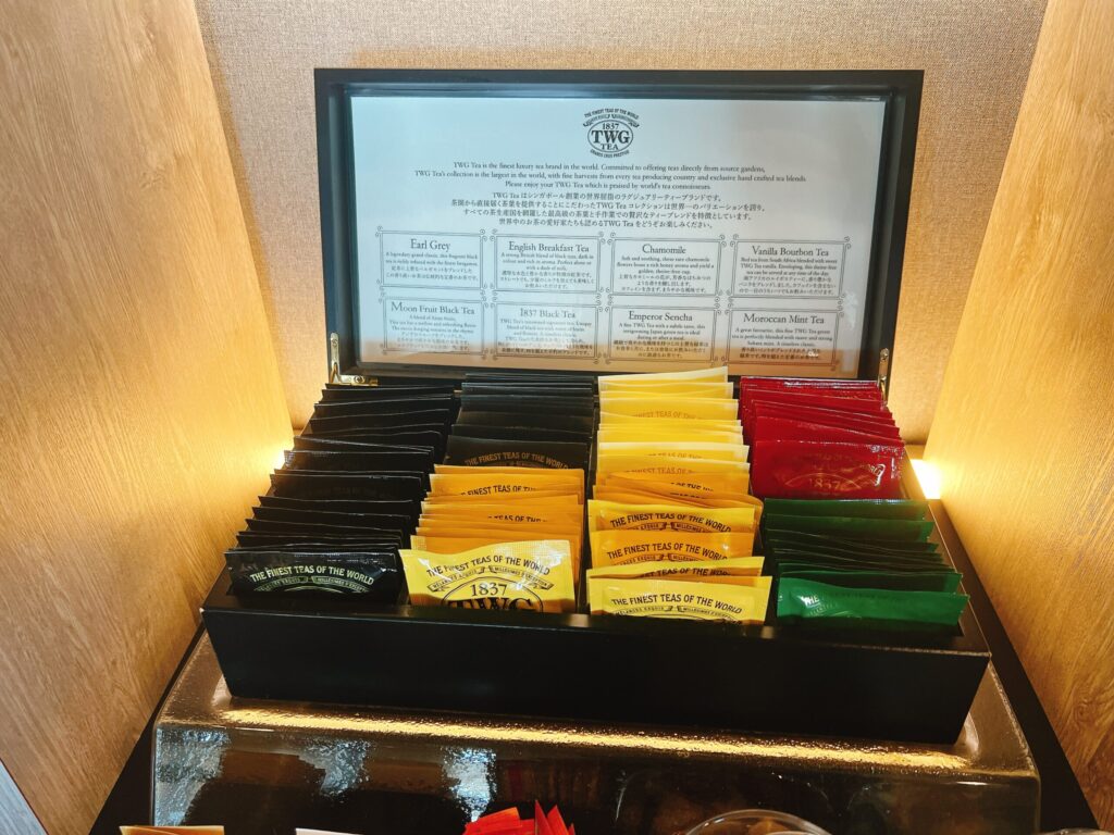 16時までのアフタヌーンティーのギリギリに滑り込みすることができました。軽食はスナック、チョコレート、ケーキ、カットフルーツなどなど。なんとこの時間でもアルコールの提供がありました。東京マリオットのラウンジは、昼からアルコールが提供されていることが特徴的なようです。お席にも余裕があって快適です。紅茶はTWGがなんと8種類も準備されています。